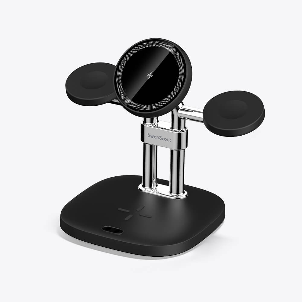 Оборудвани с издръжлива метална стойка, зарядните устройства SwanScout здраво държат вашия часовник и други устройства както във вертикално, така и в хоризонтално положение, осигурявайки стабилност без подхлъзване. Внимателно проектираната стойка подобрява използваемостта, като същевременно ефективно предотвратява случайни изпускания и повреди, осигурявайки безпроблемно зареждане.