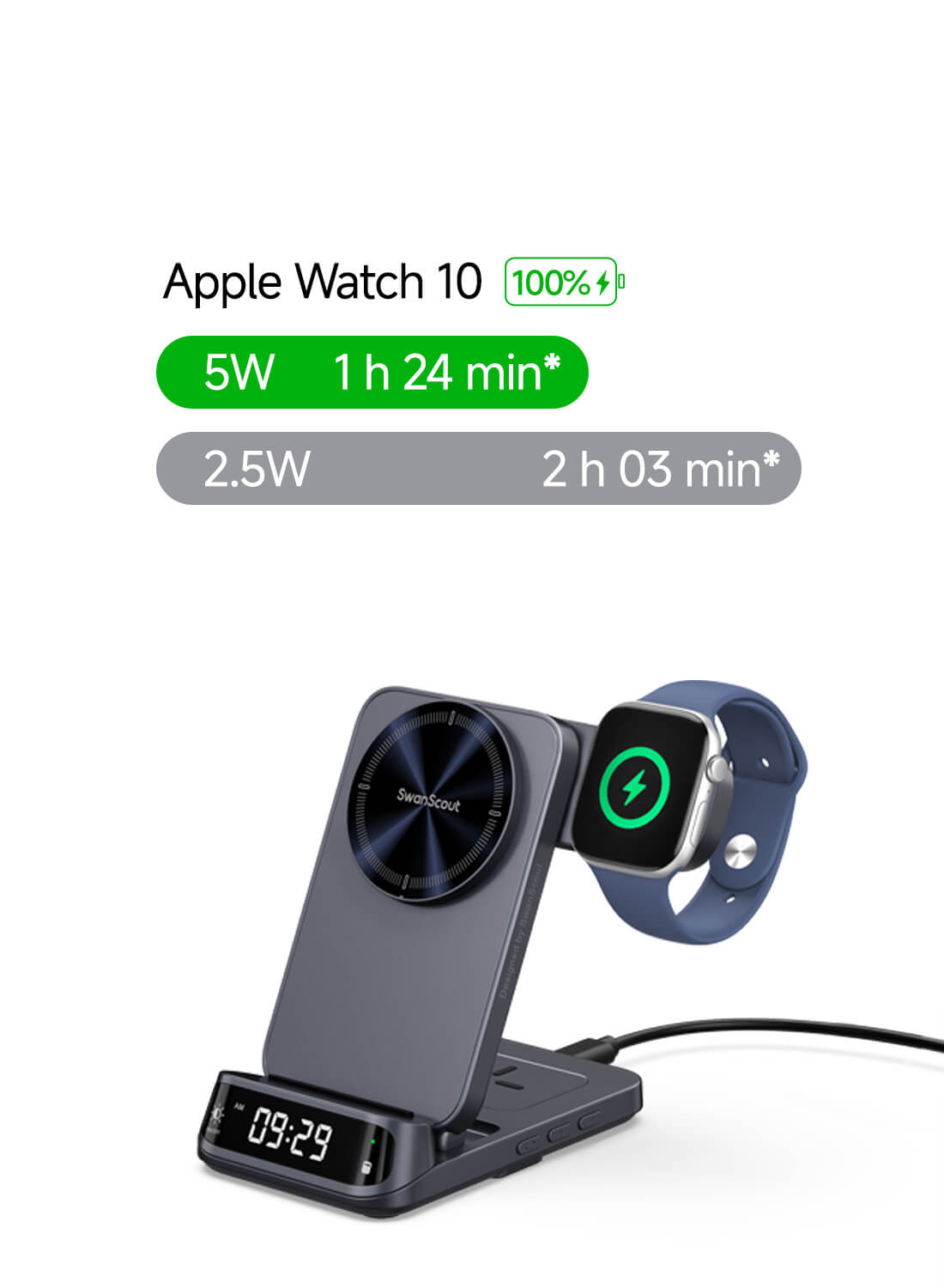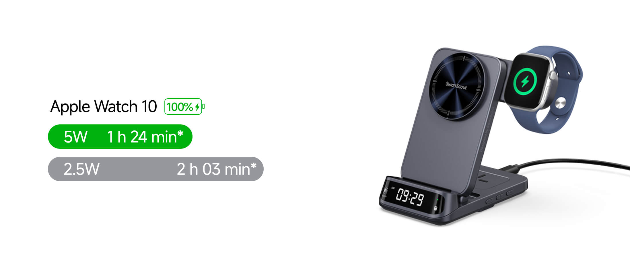 The swanscout 708M combines elegance and speed with fast wireless charging for iPhone and Apple Watch.