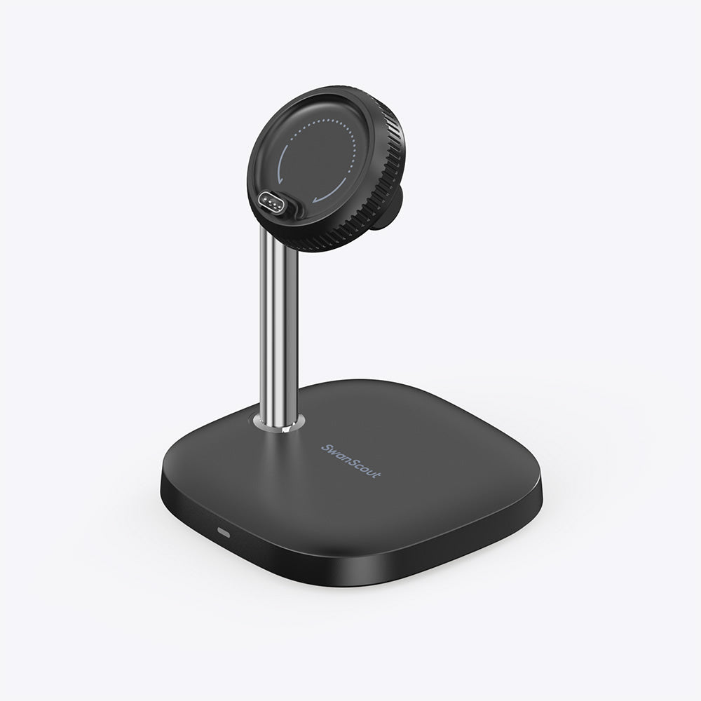 Spare 20% SwanScout 704D 3-in-1 wireless charging station simultaneously powering an Apple Watch, a Samsung Galaxy Watch, and wireless earbuds.A versatile charging stand featuring a 5W Apple Watch magnetic charger and a 2.5W Samsung Galaxy Watch wireless charger for multi-device users.