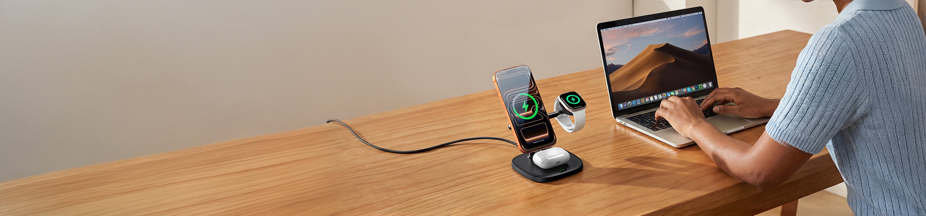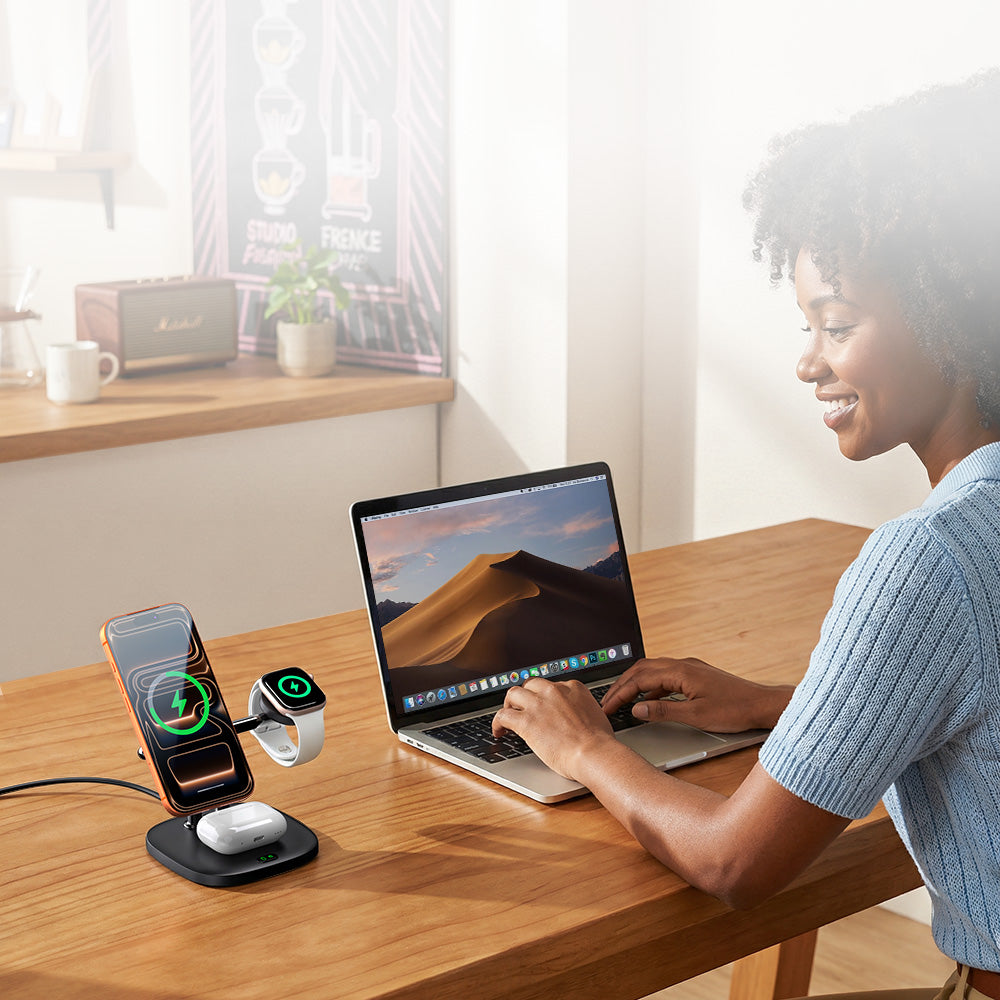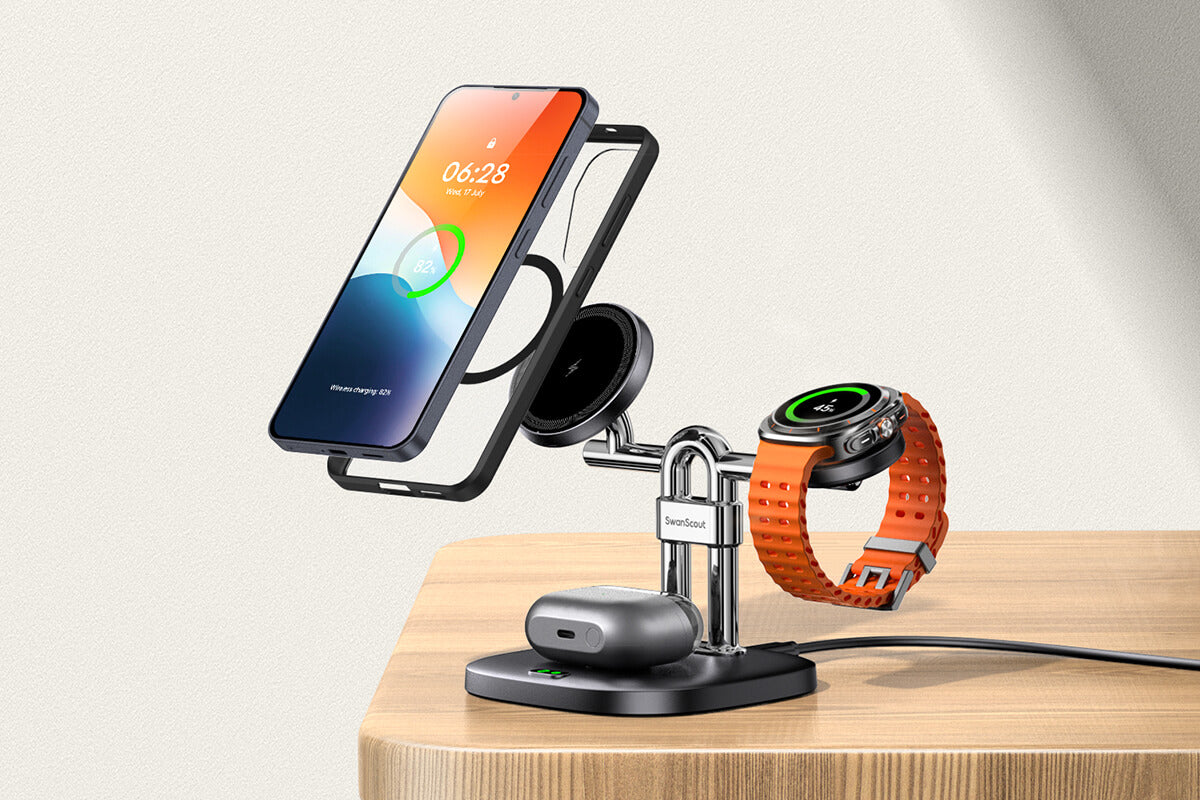 Spare 20% SwanScout 901M 5-in-1 magnetic charging station with 60W output, simultaneously powering iPhone 17, Apple Watch 10, AirPods, and an iPad.The SwanScout 901M organized on a study desk, featuring 5W fast charging for Apple Watch and a dedicated dock for tablets or Nintendo Switch.