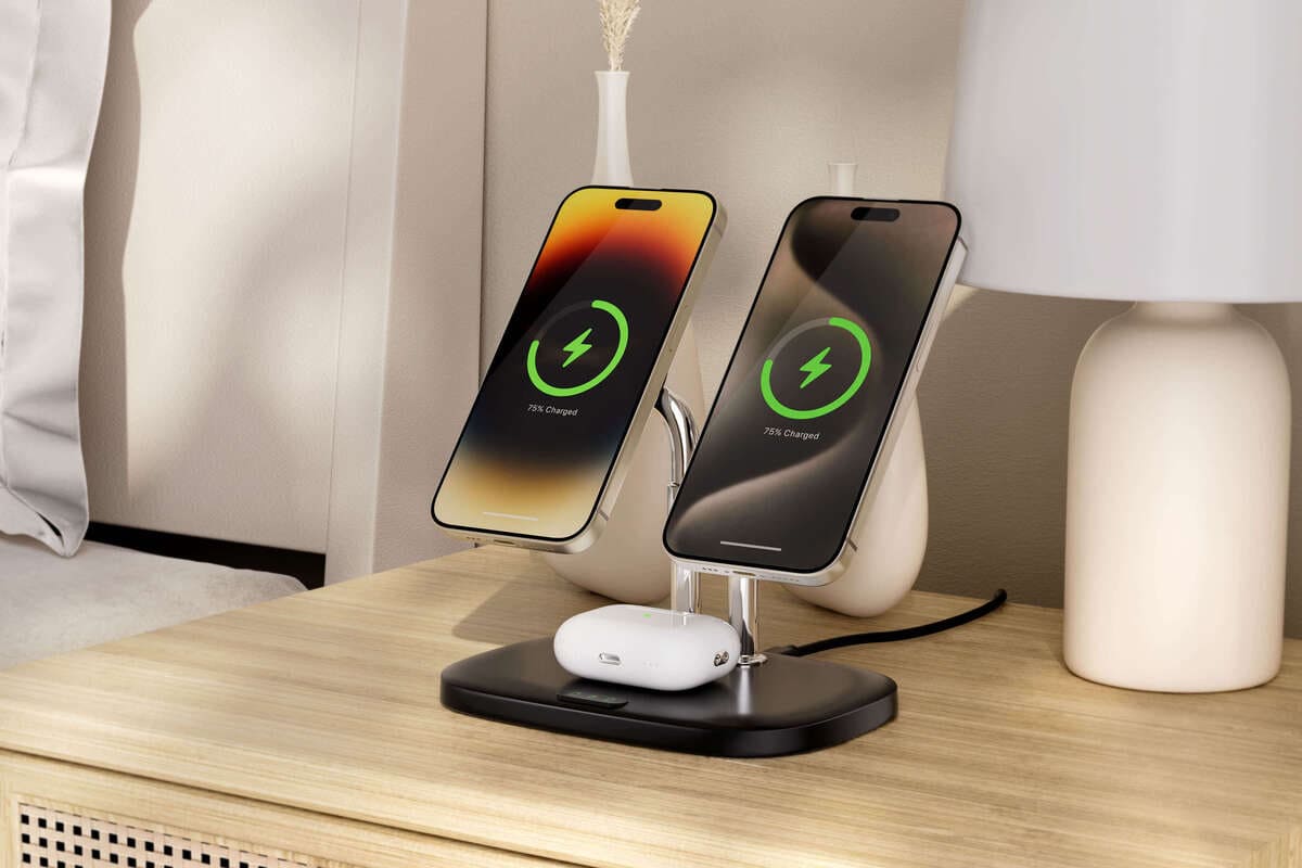 Spare 20% SwanScout 706M black 3-in-1 magnetic charging station, simultaneously powering two iPhones with MagSafe compatibility and AirPods.White SwanScout 706M magnetic wireless charger, supporting dual iPhone 16/15 series charging with an integrated 3.5W earbuds pad.