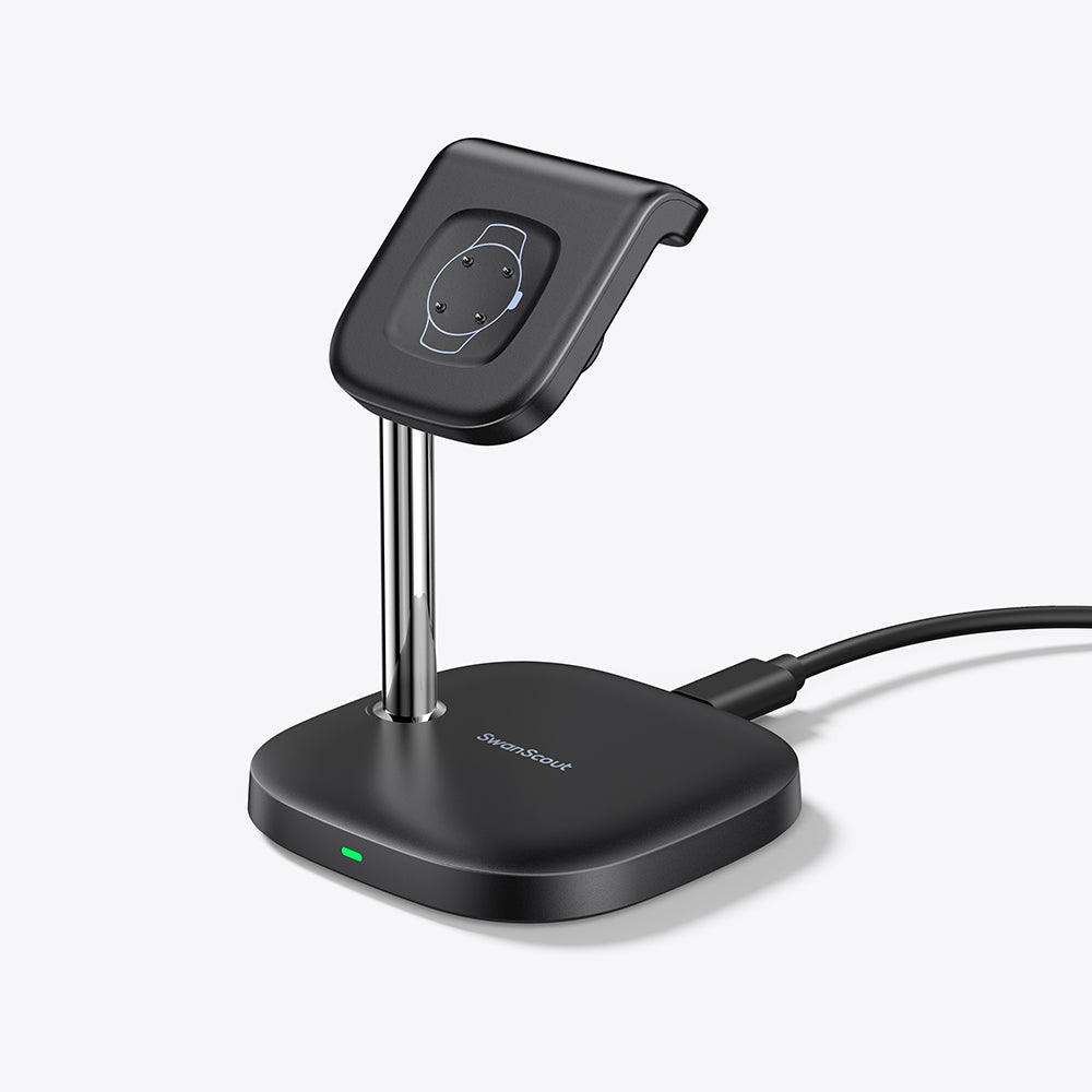 Spare 20% SwanScout 704S white wireless charging station, designed to charge two Samsung Galaxy Watches and Galaxy Buds Pro simultaneously in one compact dock.Black SwanScout 704S dual Samsung watch charger supporting Galaxy Watch 8, Ultra, and 7 series with stable wireless power delivery for bedside use.