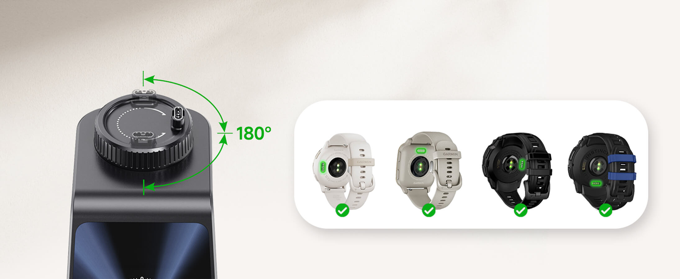 • Drehbares Uhrenladegerät: Verfügt über ein um 180° drehbares Uhrenladegerät, perfekt für verschiedene Garmin-Uhrenmodelle.