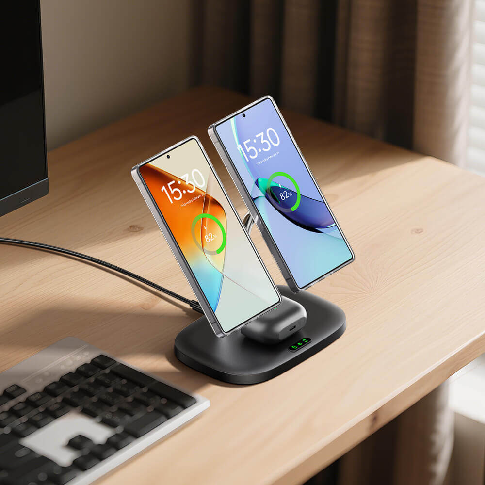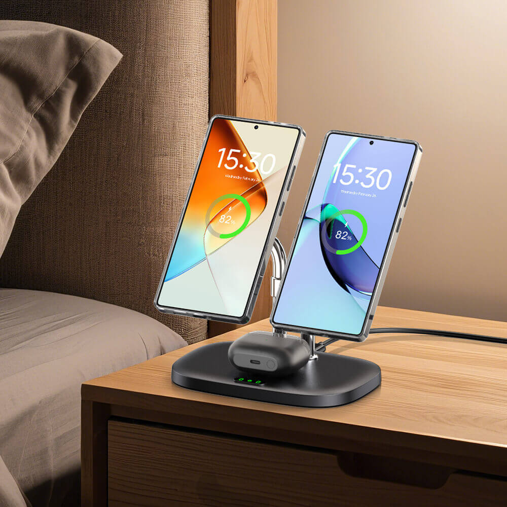 • Duales magnetisches Laden: Lädt zwei Telefone gleichzeitig mit starken Magneten, ideal für Paare, Multi-Geräte-Nutzer oder jeden, der private und berufliche Telefone verwaltet.