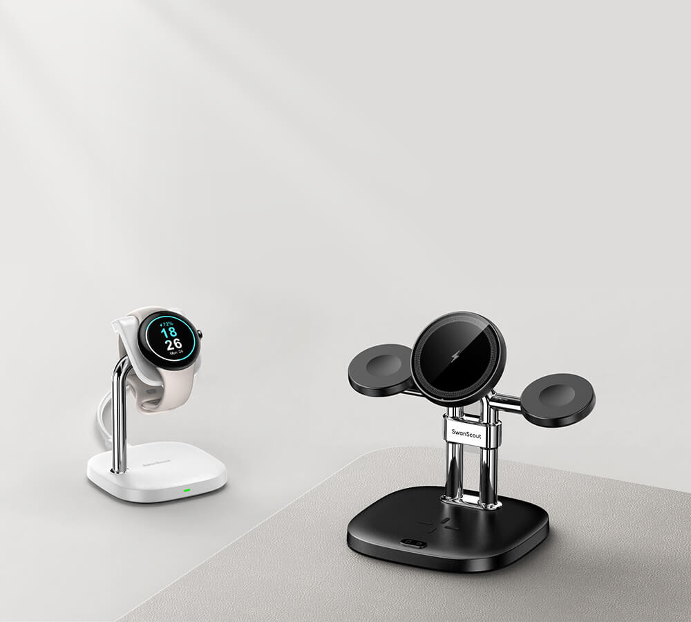 Kestävällä metallijalustalla varustetut SwanScout-laturit pitävät kellosi ja muut laitteesi tukevasti sekä pysty- että vaaka-asennossa varmistaen vakauden liukumatta. Huolellisesti suunniteltu jalusta parantaa käytettävyyttä ja estää tehokkaasti vahingossa tapahtuvat putoamiset ja vauriot, tarjoten huolettoman latauskokemuksen.