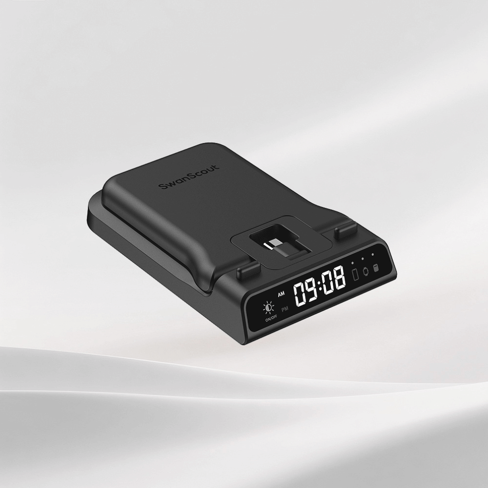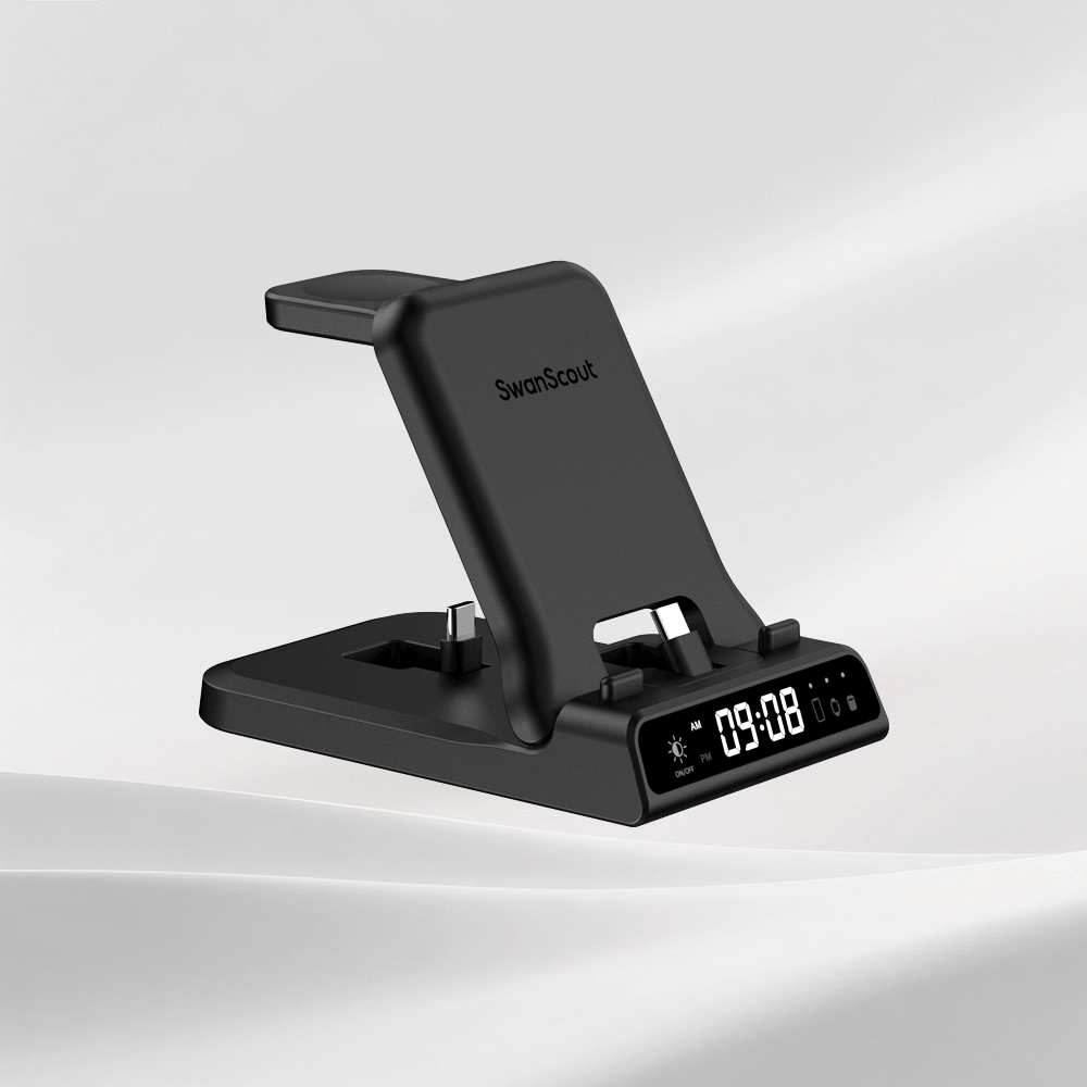 SwanScout 701A is a 3-in-1 wired fast charger compatible with Apple phones, watches, and earbuds, offering stable and efficient charging in one sleek unit.The swanscout 701A is a stylish alarm clock with cell phone charger, combining fast charging with a digital time display for added convenience.