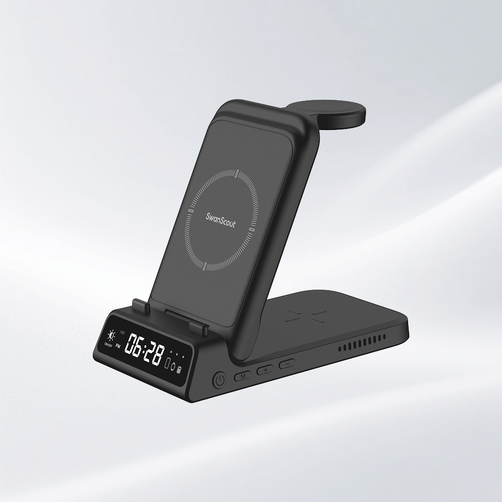 The SwanScout 703F is a sleek charging station with clock that supports wireless charging for the Samsung Z Flip 6.The SwanScout 703F is more than a Samsung charging station clock—it’s a refined centerpiece for your tech essentials.