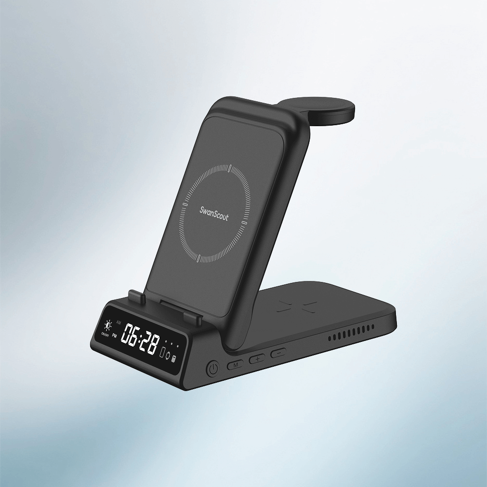 The SwanScout 703F is a sleek charging station with clock that supports wireless charging for the Samsung Z Flip 6.The SwanScout 703F is more than a Samsung charging station clock—it’s a refined centerpiece for your tech essentials.