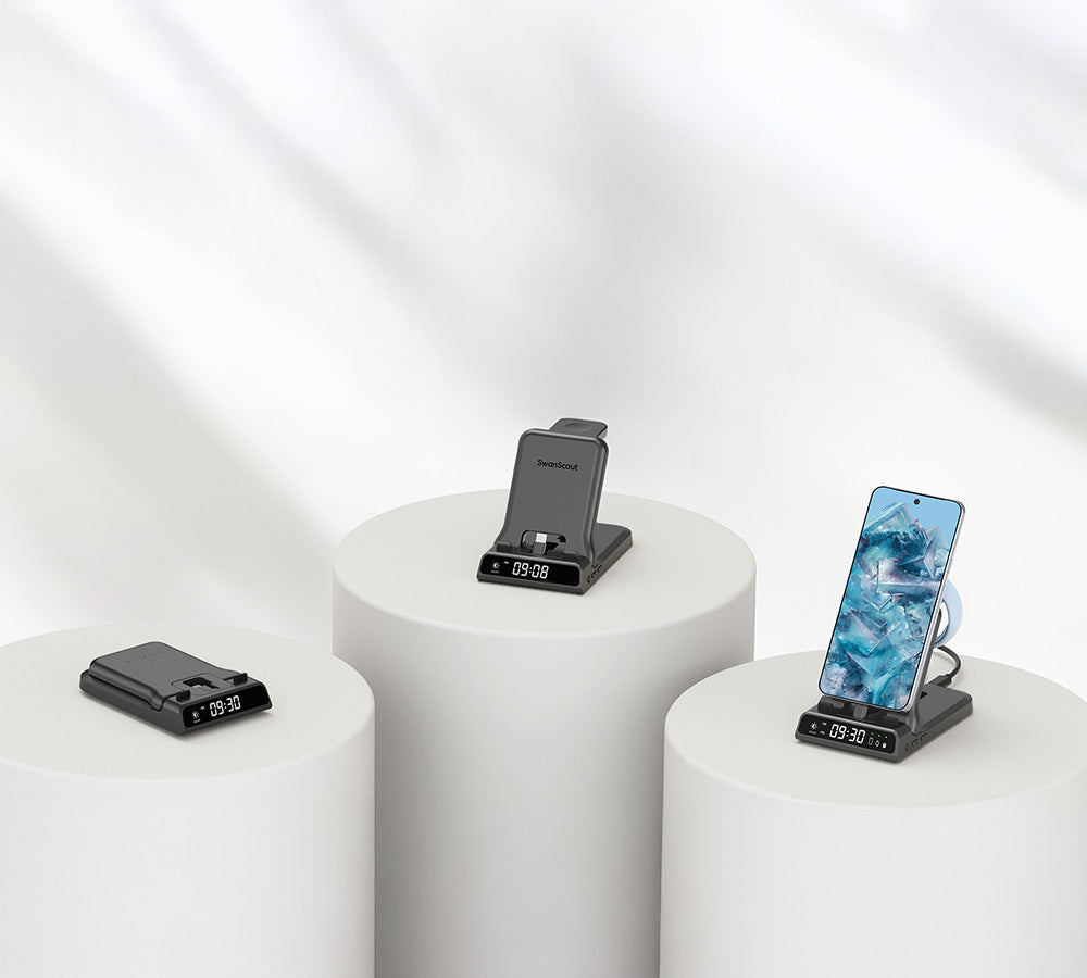 SwanScout 701A is a 3-in-1 wired fast charger compatible with Apple phones, watches, and earbuds, offering stable and efficient charging in one sleek unit.The swanscout 701A is a stylish alarm clock with cell phone charger, combining fast charging with a digital time display for added convenience.