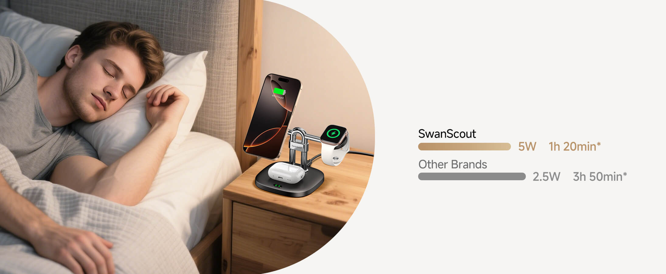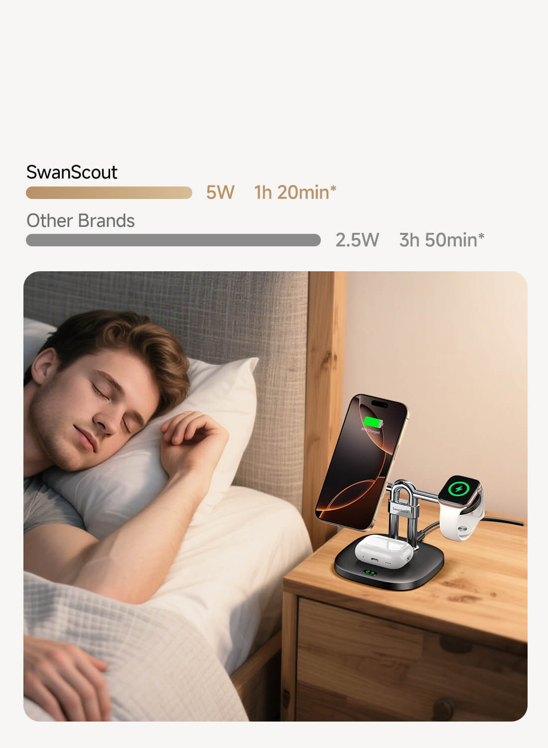 - Desfrute de carregamento rápido de 5W para Apple Watch, atingindo 80% em apenas 51 minutos — 47% mais rápido do que os carregadores padrão de 2,5W.
