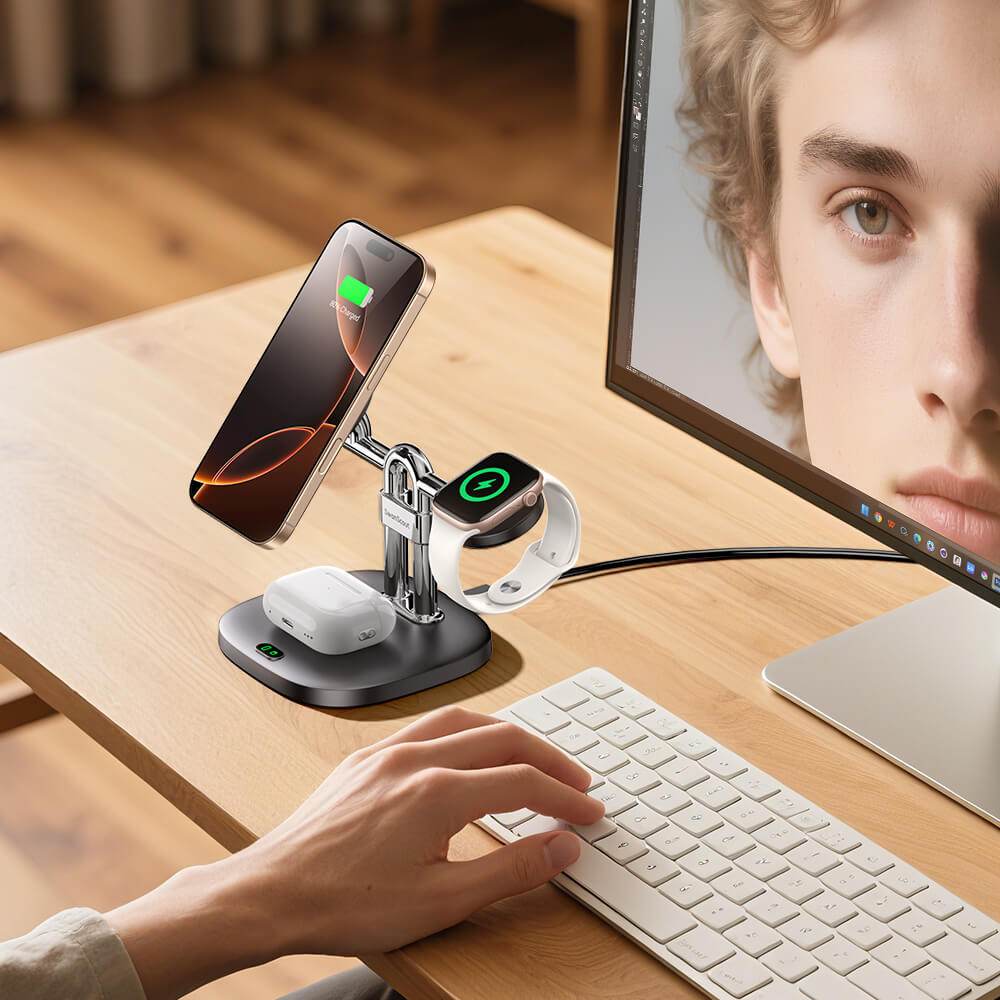 هذا المنتج معروف أيضًا باسم قاعدة شحن لاسلكية 3 في 1 لـ MagSafe، محطة شحن لاسلكية مغناطيسية لأجهزة Apple، قاعدة شحن لهواتف iPhone وAirPods وApple Watch. بغض النظر عن الاسم، فهو يشحن أجهزة Apple بكفاءة وموثوقية.