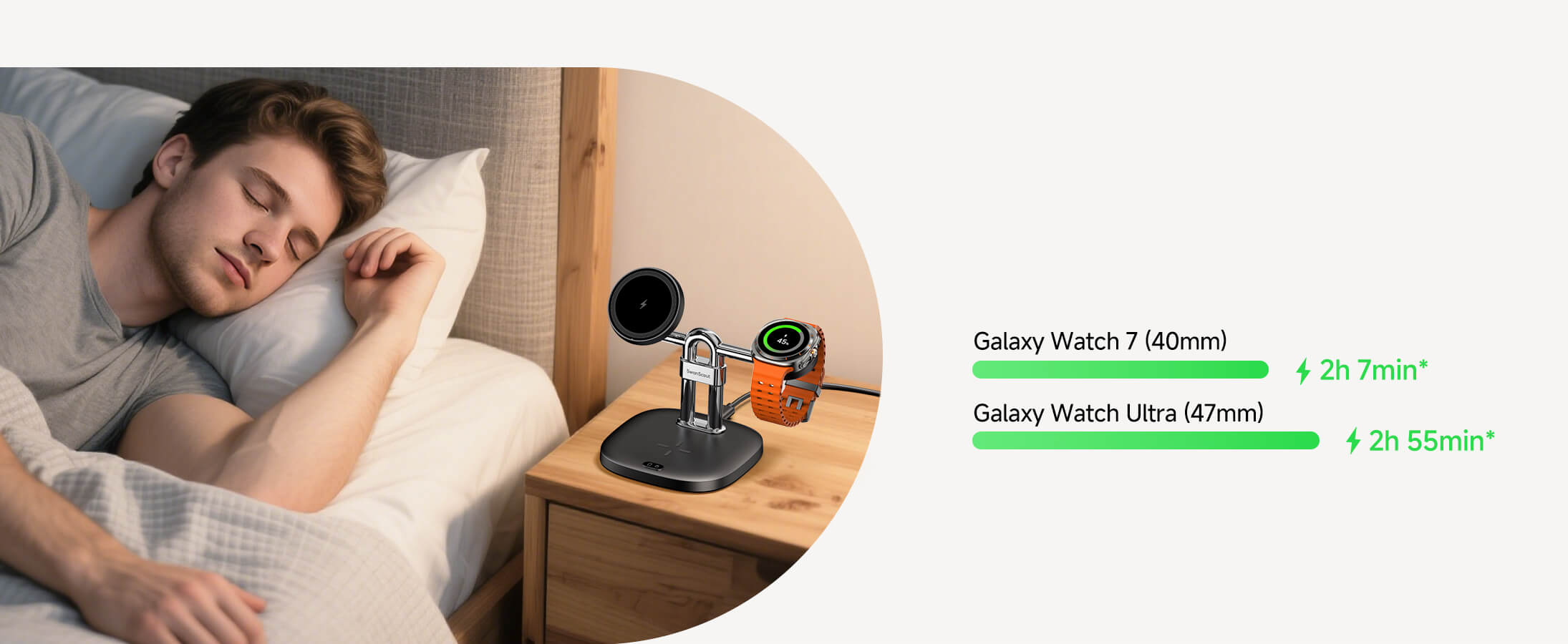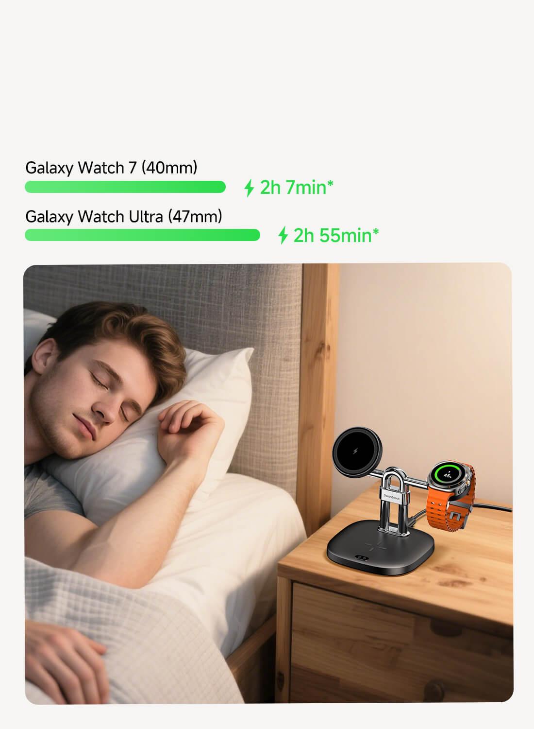 • Încărcare magnetică 3-în-1: Încarcă simultan telefon Galaxy (necesită husă magnetică), Watch și căști. Este necesar adaptor 20W+ PD (nu este inclus).