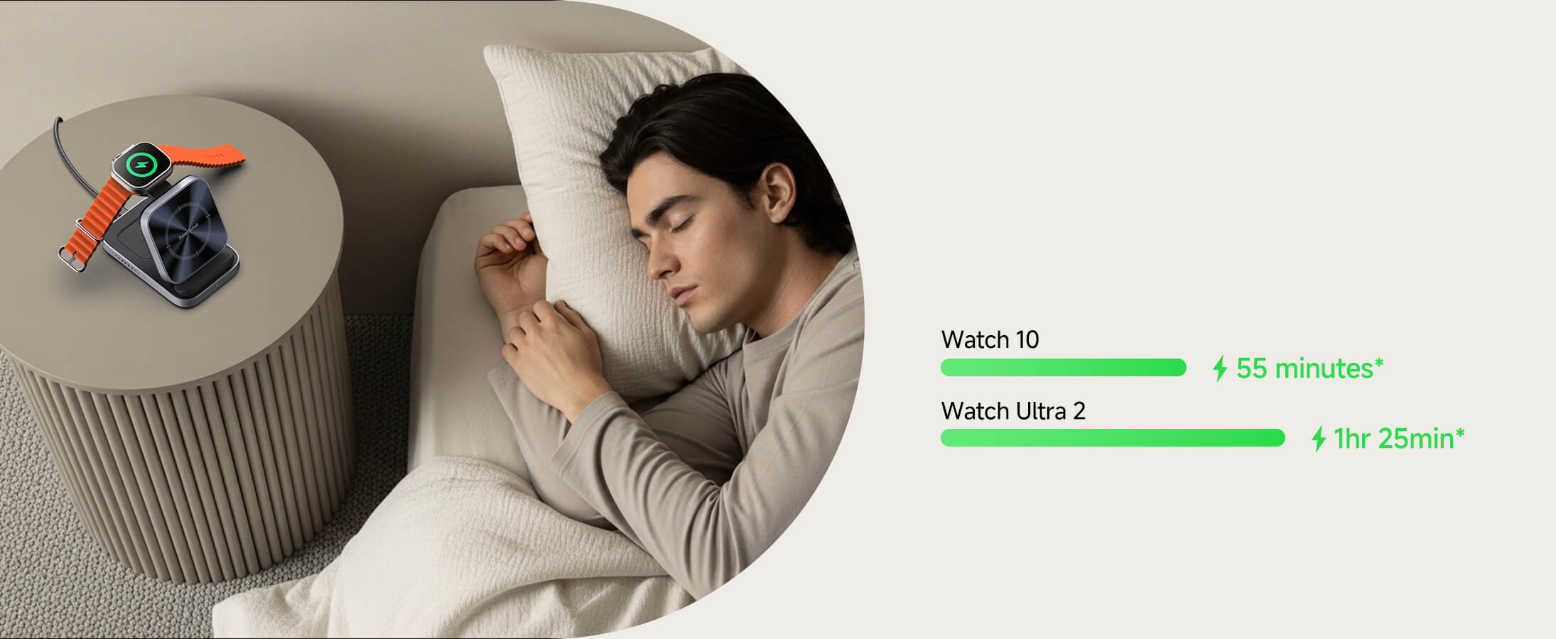 • Încărcare rapidă Apple Watch: Oferă încărcare rapidă de 5W pentru Apple Watch Series 7 și modelele ulterioare — încărcați Apple Watch Series 10 de la 0% la 80% în doar 51 de minute.